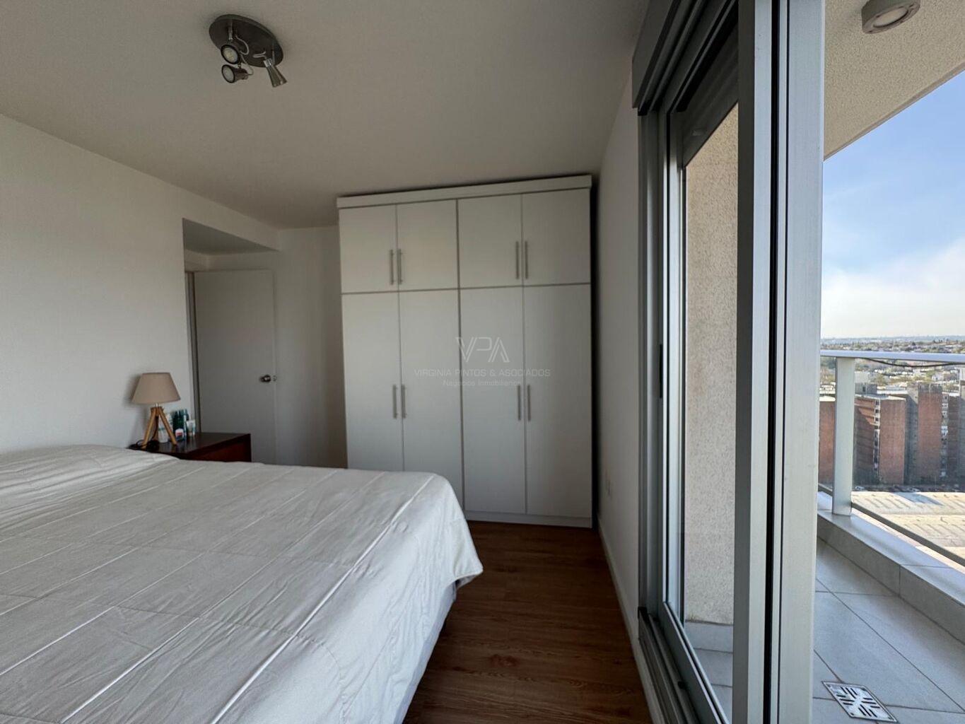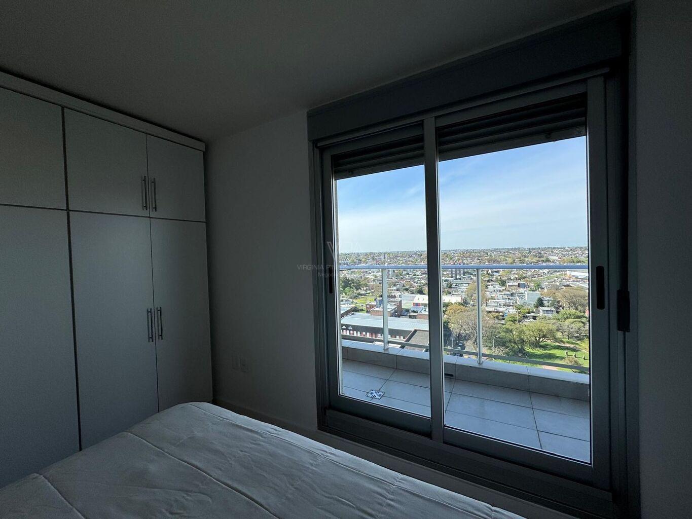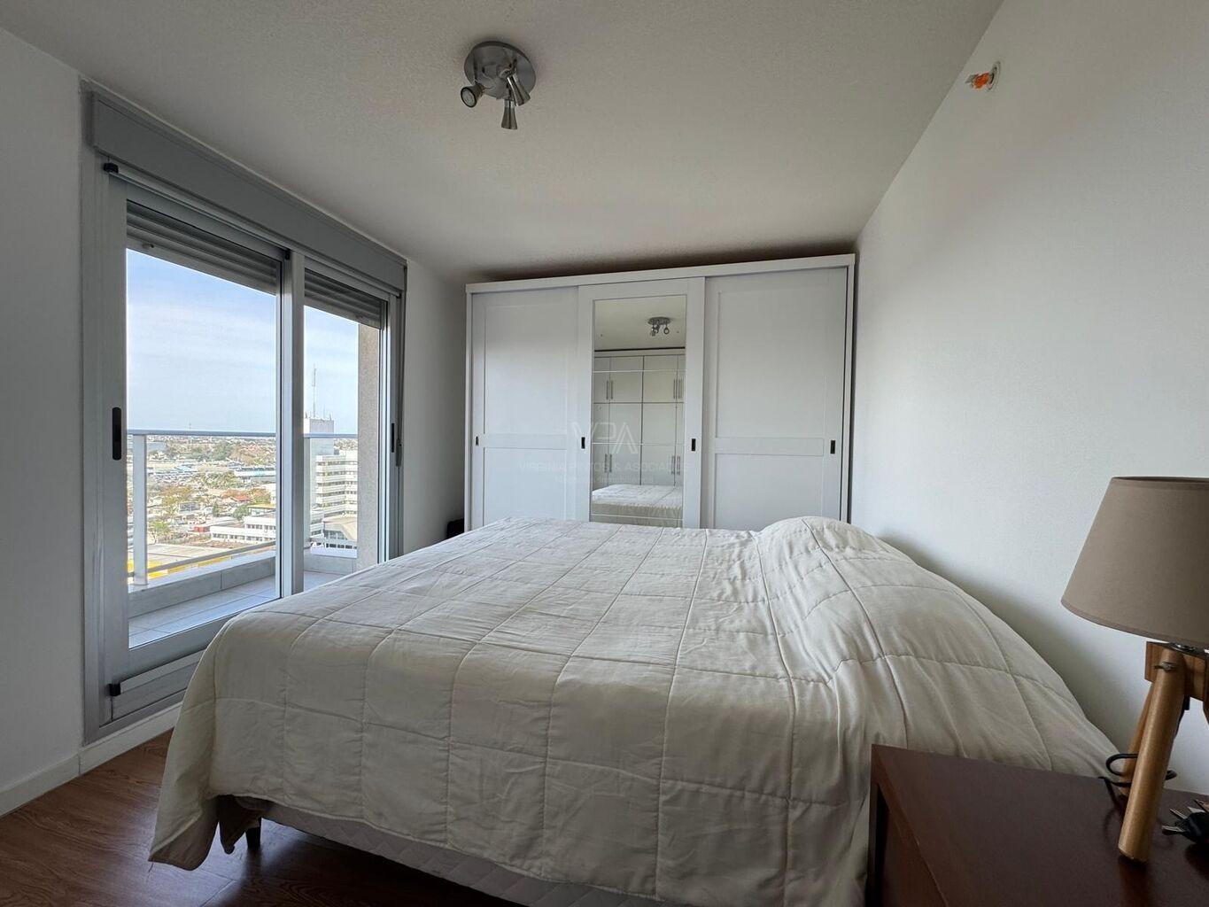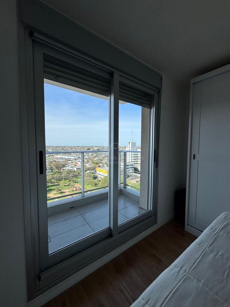 Torre Nuevo Centro, precioso apartamento semi equipado en piso 14 de 2 dormitorios con placares dobles en cada uno, 1 baño con ducha, cocina integrada semi equipada capana, horno empotrado, anaffe de 4 hornallas, aire acondicionado, terraza lavadero con conexión para lavaropas, en excelente estado de mantenimiento, amplios ventanales con balcón frances y terraza en dormitorio principal, muy soleado, vista despejada, imperdible